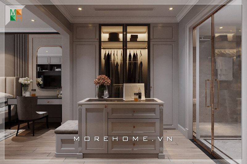 Ấn tượng với mẫu thiết kế phòng thay đồ với tủ quần áo âm tường cùng đảo phụ kiện chung cư, biệt thự, nhà phố đa năng được đặt ngay giữa trung tâm không gian căn phòng.