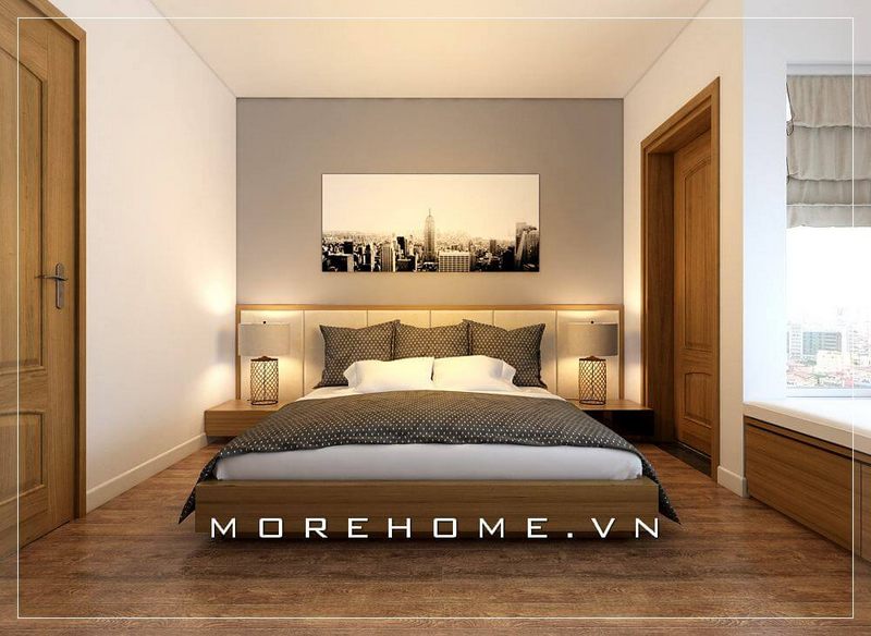 Thiết kế giường ngủ chung cư hiện đại ấn tượng với gam màu vàng gỗ nhẹ nhàng, ấm áp