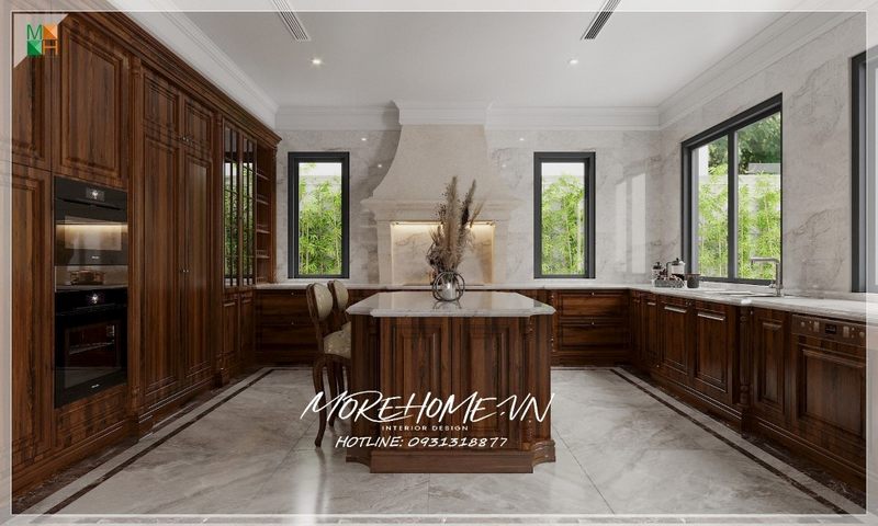 Thiết kế phòng bếp cho biệt thự theo phong cách cổ điển với sự sang trọng.